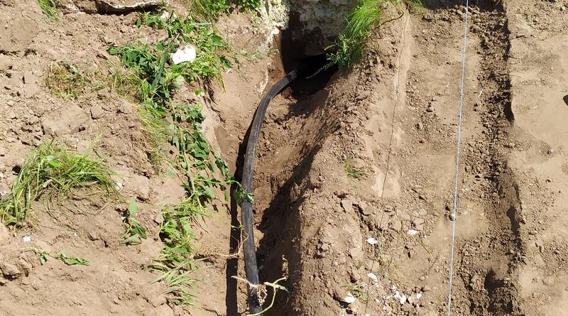 - Раскапывание траншеи вдоль маршрута, установка ПНД трубы в траншею с учетом глубины и наклона.